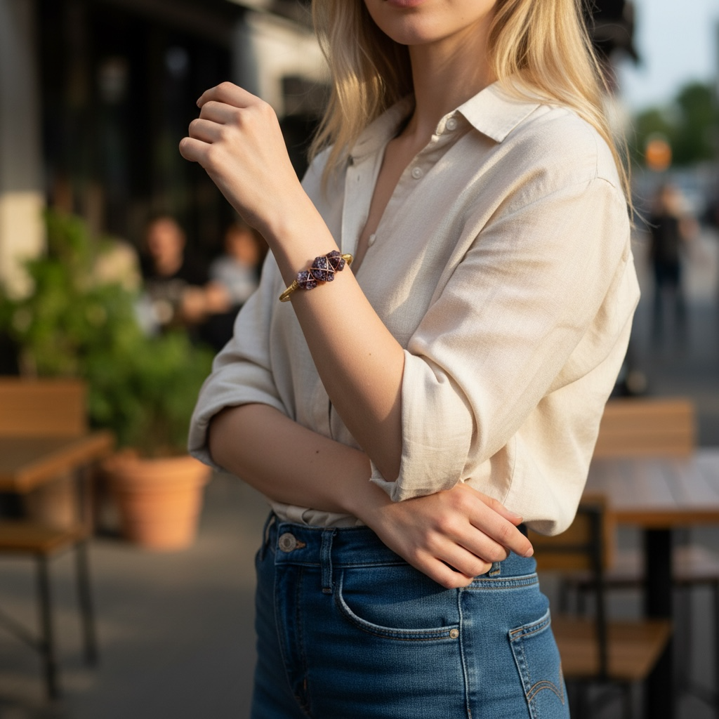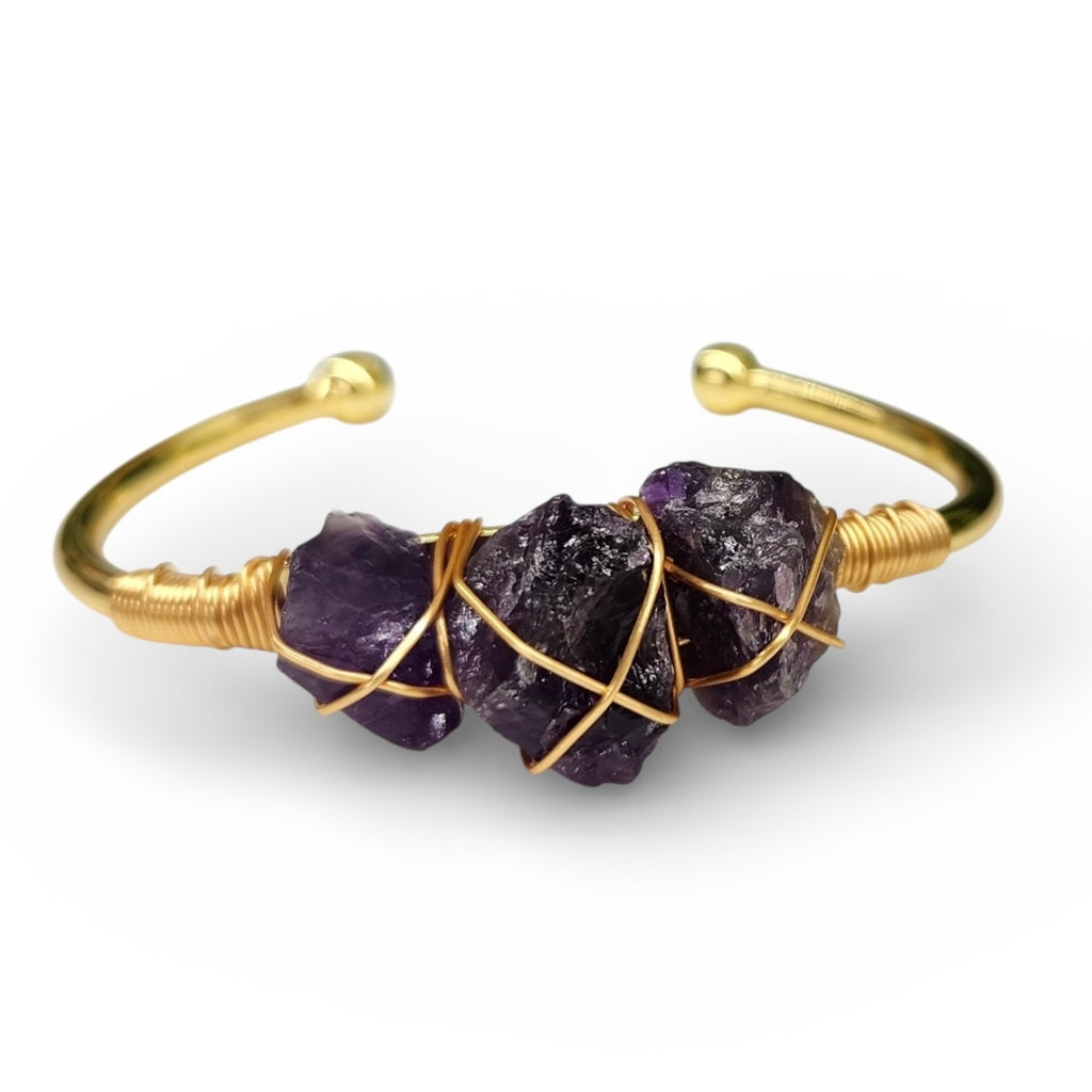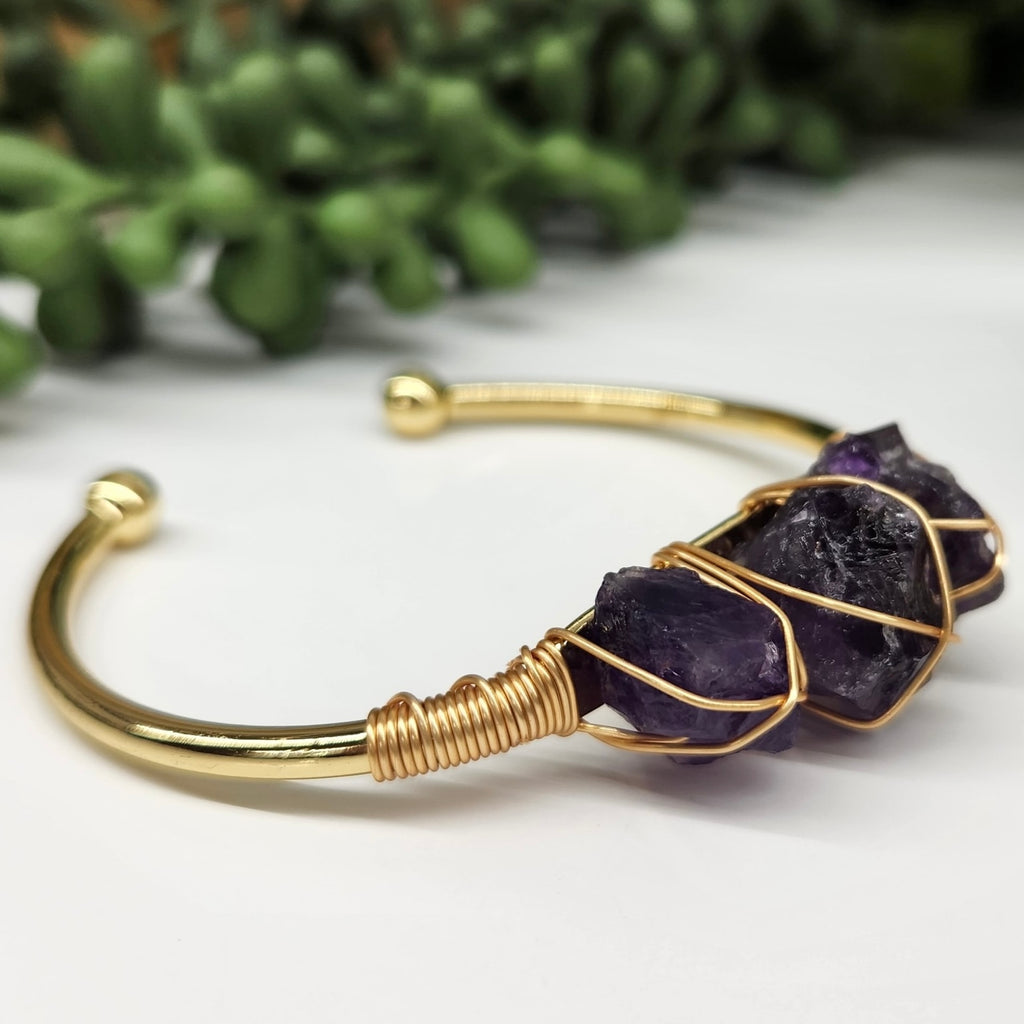 Rough Amethyst stones Wire-Wrapped to form this beautiful cuff bracelet. Fits well on most wrists. There are slight variations due to the natural character of this product.